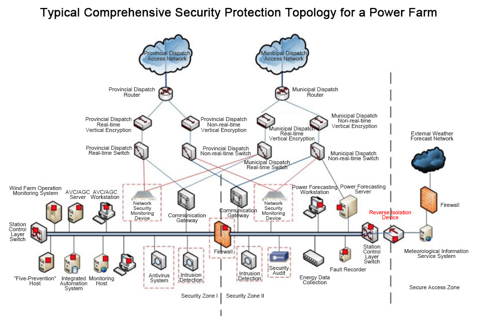 In accordance with the Cybersecurity Law of the People's Republic of China, the Implementation Guidelines for Classified Protection, and the requirements of the National Energy Administration on the security protection of SCADA systems for new energy power stations, the in-depth security protection follows the basic principles of "security zoning, dedicated networks, horizontal isolation, and vertical authentication" [also known as the "16-character policy"] and other relevant policies, providing planning and design solutions for power plant security protection systems.