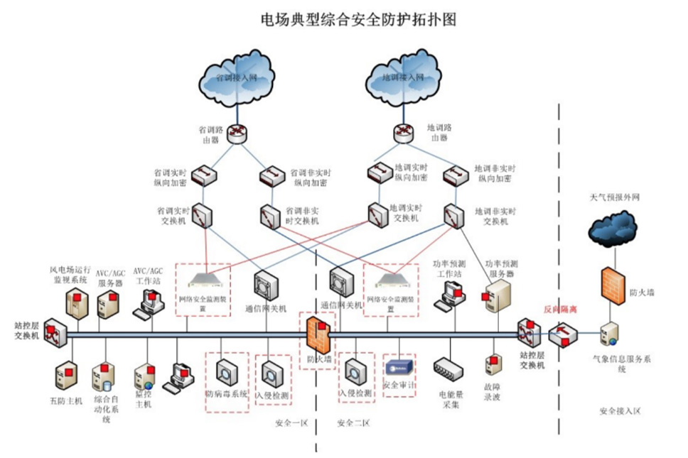根据《中华人民共和国网络安全法》、《等级保护实施指南》及国家能源局关于新能源场站SCADA系统安全防护的要求,纵深安全防护遵循“安全分区、网络专用、横向隔离、纵向认证”基本原则【亦称“十六字”方针】等相关政策,提供针对电场安全防护系统的建设方案规划与设计。